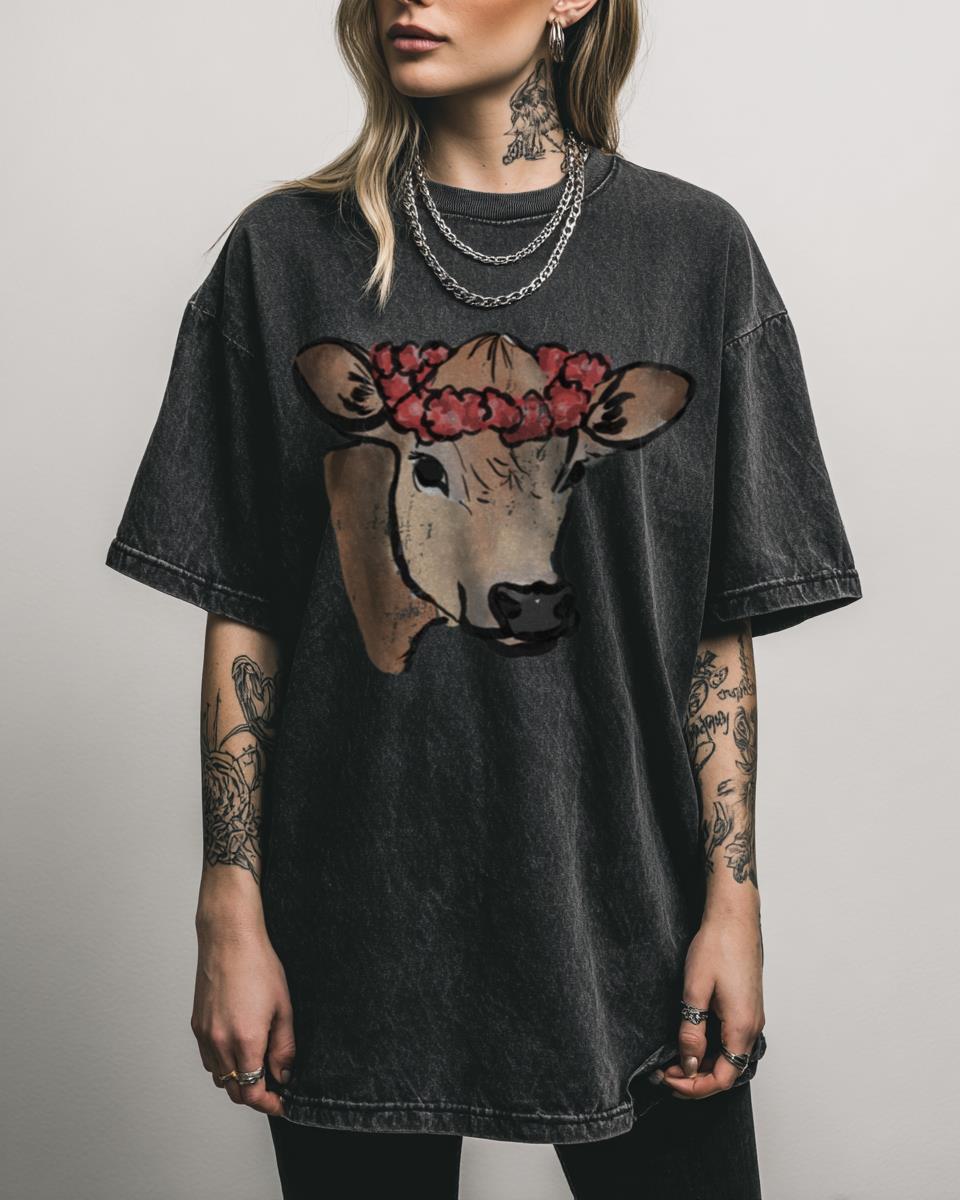 Why is This Milk Maiden Cow with Flower Crown T-Shirt So Charming? Embrace a touch of rustic charm with this enchanting Milk Maiden Cow with Flower Crown T-Shirt! Featuring a whimsical fan-created graphic of a cow adorned with a delicate flower crown, this black acidwash graphic tee is perfect for lovers of cottagecore aesthetics, farm…