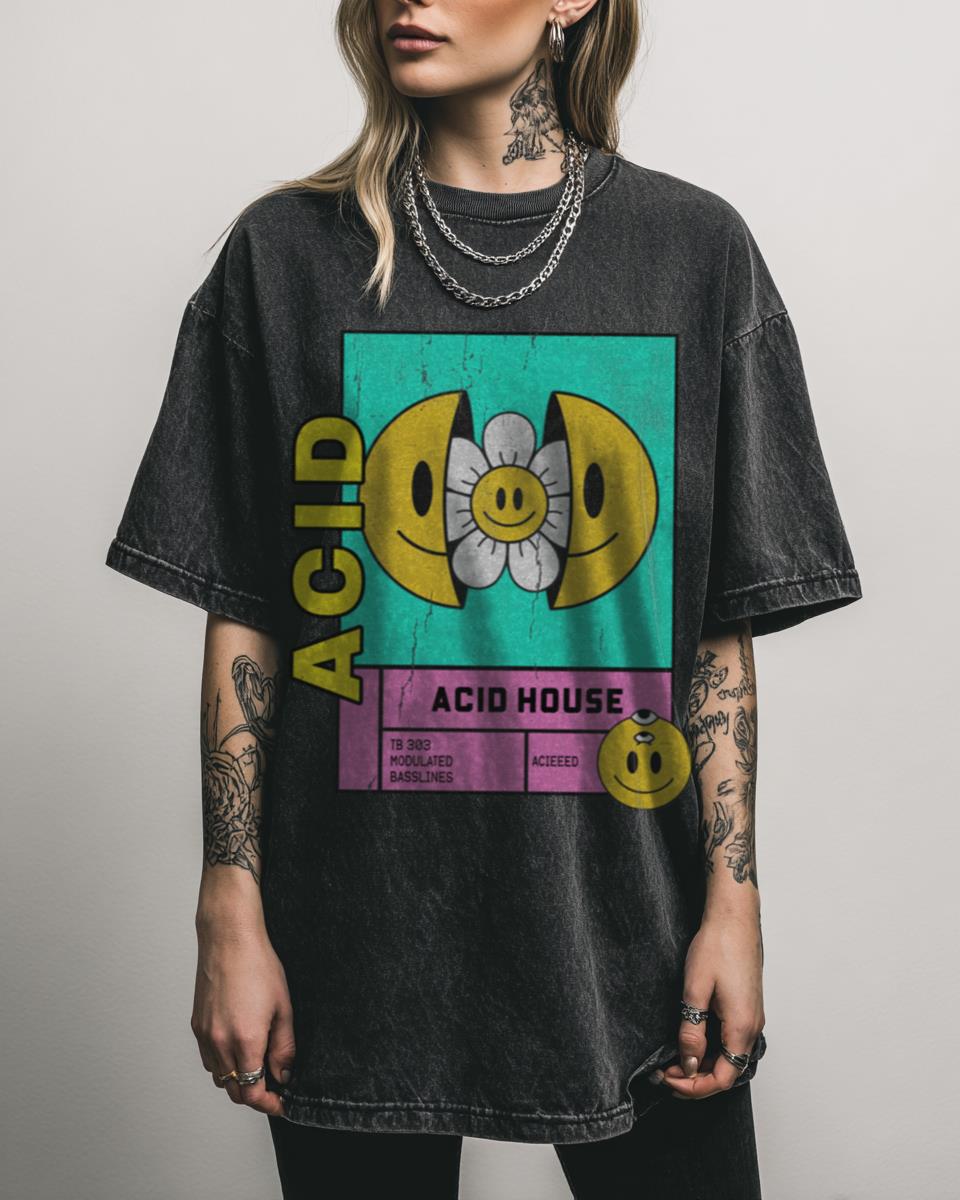 What Makes This Acid House Flower T-Shirt a Retro Hit? Groove to the beat of the past with this vibrant Acid House Flower T-shirt. Featuring a unique floral take on classic acid art and 80s electronic music culture, this black acidwash tee is perfect for any dance music enthusiast. Key Highlights of This Retro Music…