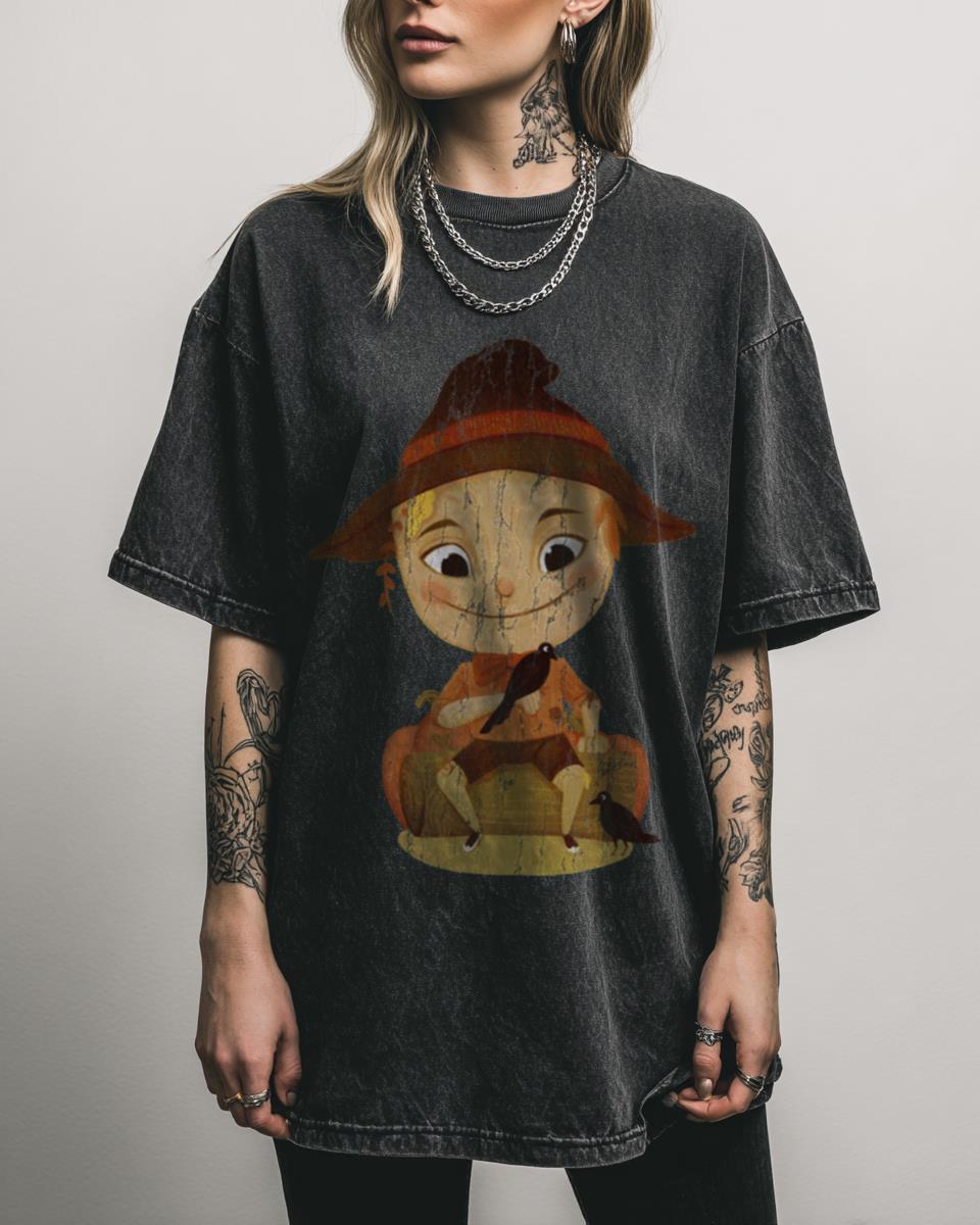 What Makes This Scarecrow with Wooden Legs T-Shirt So Charming? Discover a touch of whimsical charm with this unique Scarecrow with Wooden Legs T-Shirt. Featuring a delightful graphic of a happy scarecrow accompanied by a crow, this black acidwash tee is perfect for those who appreciate folk art, fantasy, and charming character designs. Key Features…