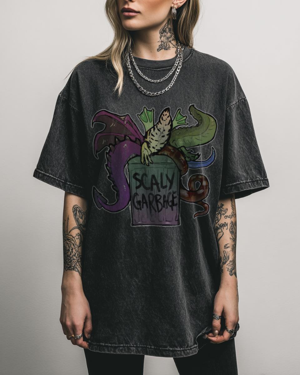 Why Choose the Funny Scaly Creatures & Frog in a Trash Can Tee? Add a touch of whimsical humor to your wardrobe with this ‘Scaly Things and a Frog in a Trash Can’ graphic t-shirt. Featuring a delightfully silly design of various scaly creatures and a frog, this black acidwash tee is perfect for those…