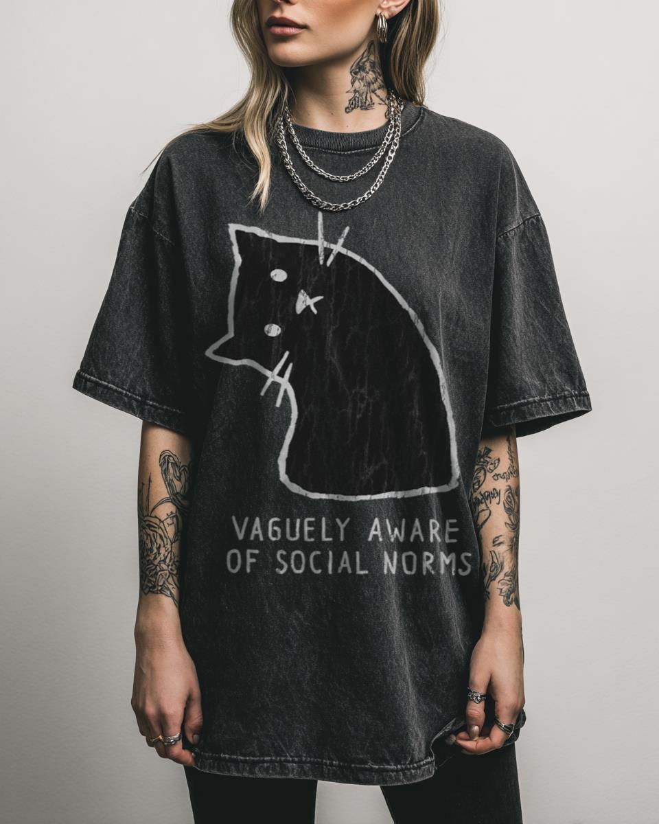 Do you sometimes feel ‘Vaguely Aware of Social Norms’? Express your relatable awkwardness with this ‘Vaguely Aware of Social Norms Cat’ T-Shirt. This humorous design features a vintage-style cat with an anime twist, perfectly capturing that feeling of being just slightly out of sync with social expectations. A funny and stylish piece for cat lovers…