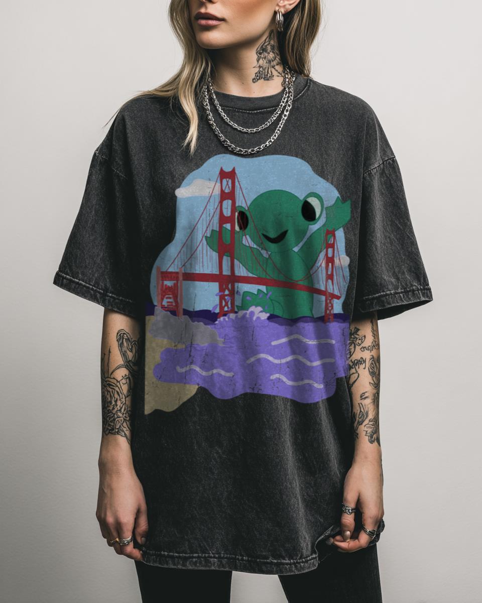 Ready for a whimsical yet epic kaiju encounter on your next graphic tee? Witness the ‘Attack of Frogera’ with this unique graphic t-shirt, where a cute giant monster frog takes on the Golden Gate Bridge. This design blends adorable charm with the thrill of a kaiju attack, set against an ocean backdrop. It’s a playful…