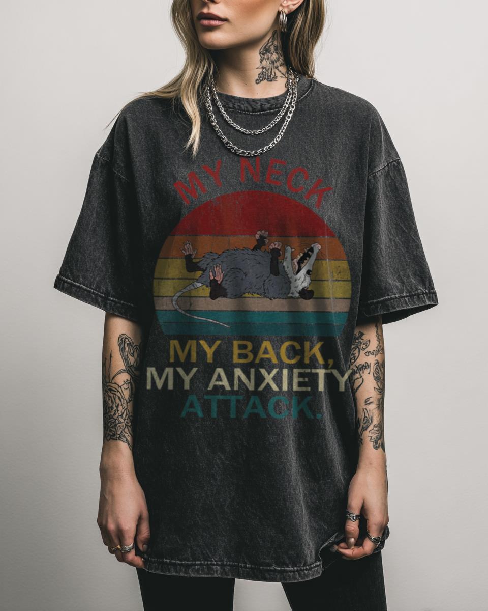 Feeling the modern-day struggle? This hilarious tee perfectly sums it up! Embrace the relatable humor with our ‘My Neck My Back My Anxiety Attack’ design, featuring a charmingly stressed opossum. This vintage-style graphic perfectly captures the mood of anyone dealing with daily anxieties, making it a funny and unique statement piece for animal lovers with…