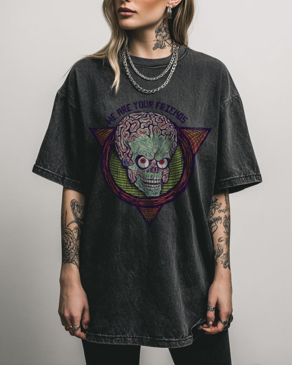 Make New Friends with This Alien Sci-Fi Horror Acidwash Tee! Get ready for some out-of-this-world fun with this “we are your friends” alien T-shirt. Featuring a fan-inspired graphic that blends sci-fi, horror, and humor, this black acidwash tee is perfect for those who love quirky alien encounters. Why This Funny Alien Tee is a Unique…