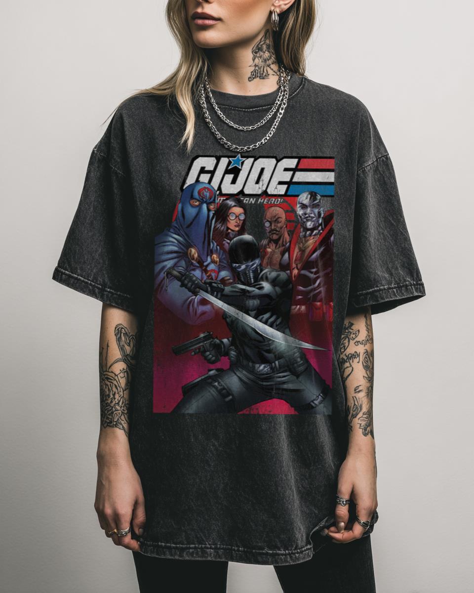 Do you remember the thrilling adventures of a real American hero from the 80s? Relive the nostalgia with this “A Real American Super Hero” T-shirt, celebrating the iconic G.I. Joe character, Snake Eyes! This design harks back to the classic 80s toys, cartoons, and comics, featuring elements related to Cobra, Baroness, and the Arashikage clan….