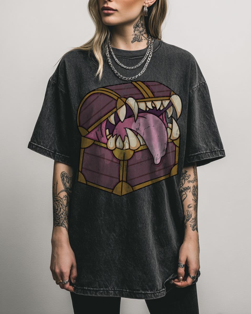 Beware, adventurers! Not all treasure chests are what they seem… Show off your love for classic tabletop RPGs and their most infamous traps with this ‘Mimic Chest’ design! This creepy graphic features the iconic Dungeons & Dragons monster, disguised as a tempting treasure chest but revealing its sharp teeth, ready to surprise unsuspecting adventurers. A…