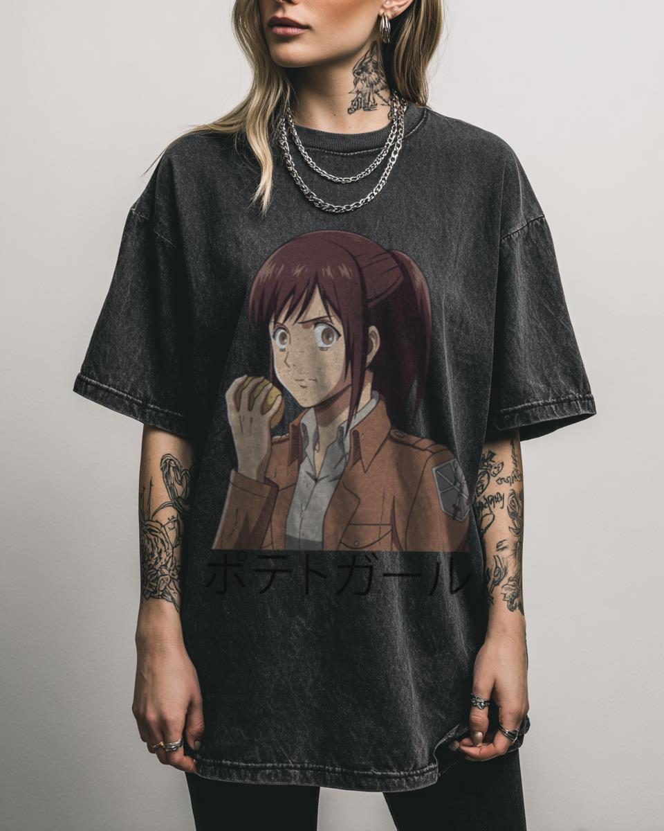 Why This ‘Potato Girl’ Sasha Braus Attack on Titan Tee is Hilarious? Indulge your appetite for humor with this Potato Girl Sasha Braus Attack on Titan Anime Tee. Featuring a fan-created graphic of the iconic Survey Corps member and her love for potatoes, this funny black acidwash shirt is a perfect meme-inspired piece for AOT…