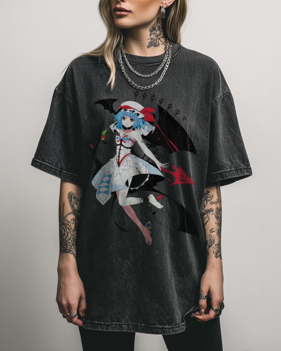 Are you ready to serve the mistress of the Scarlet Devil Mansion? Embrace the gothic charm of the Touhou Project with this adorable ‘Remilia Scarlet’ graphic tee. This design celebrates the cute vampire mistress, capturing her fantastical and elegant essence from the popular Japanese videogame series. Perfect for otaku, gamers, and fans of unique vampire…