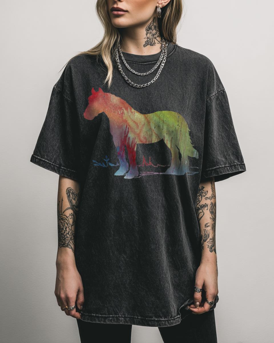 Looking for a vibrant and artistic piece for a horse lover? This charming “Horse” tee features a beautiful abstract watercolor painting of a horse, bursting with blue, green, red, and yellow hues. It’s a cute and colorful animal art design, perfect for horse enthusiasts, art lovers, or as a sweet gift for a girl or…
