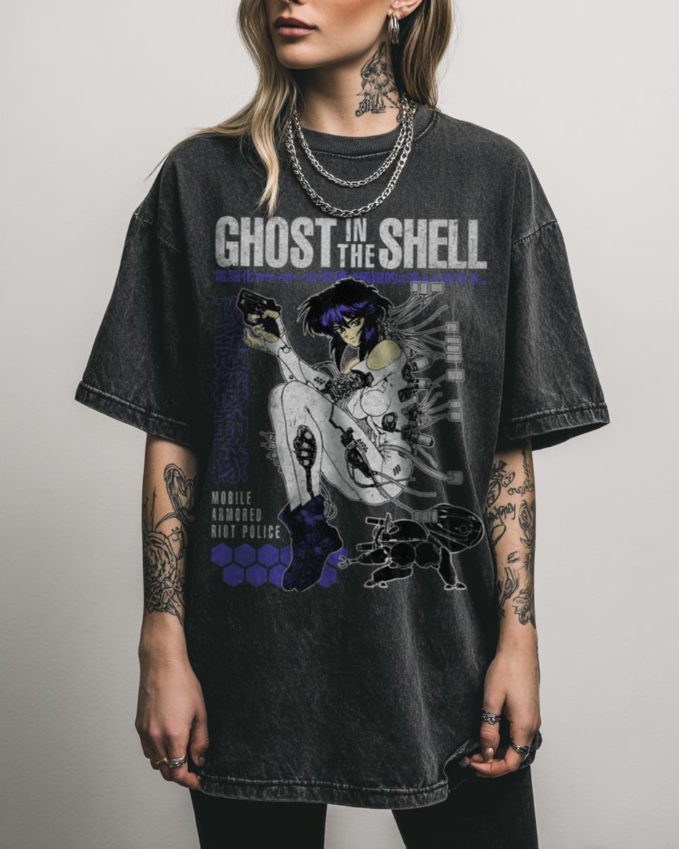 Do you appreciate the serene yet complex world of the 1995 Ghost in the Shell film? Dive into the atmospheric depths of the original ‘Ghost in the Shell’ with this ‘n°4’ design. This piece evokes the cool, contemplative cyberpunk aesthetic of the 1995 anime, featuring Major Motoko Kusanagi in a reflective moment. It’s an ideal…
