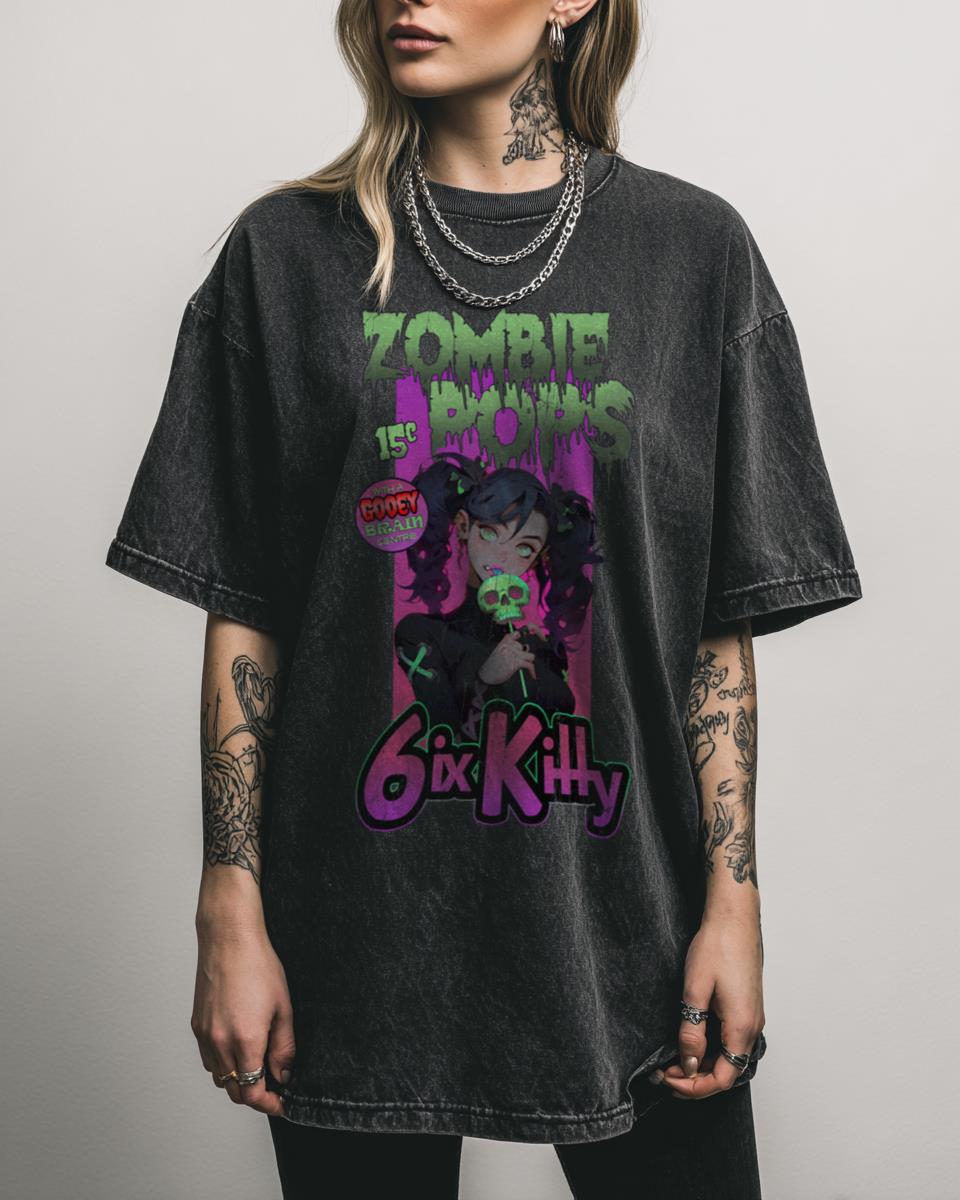Craving a sweet treat with a spooky twist? Indulge in some delightfully dark humor with this ‘Zombie Pops’ graphic tee. Featuring cute yet creepy zombie-themed candy and skulls in a gothic, anime-inspired style, this design offers a cool and funny take on horror, perfect for fans of Wednesday Addams vibes and unique humor. Why You’ll…