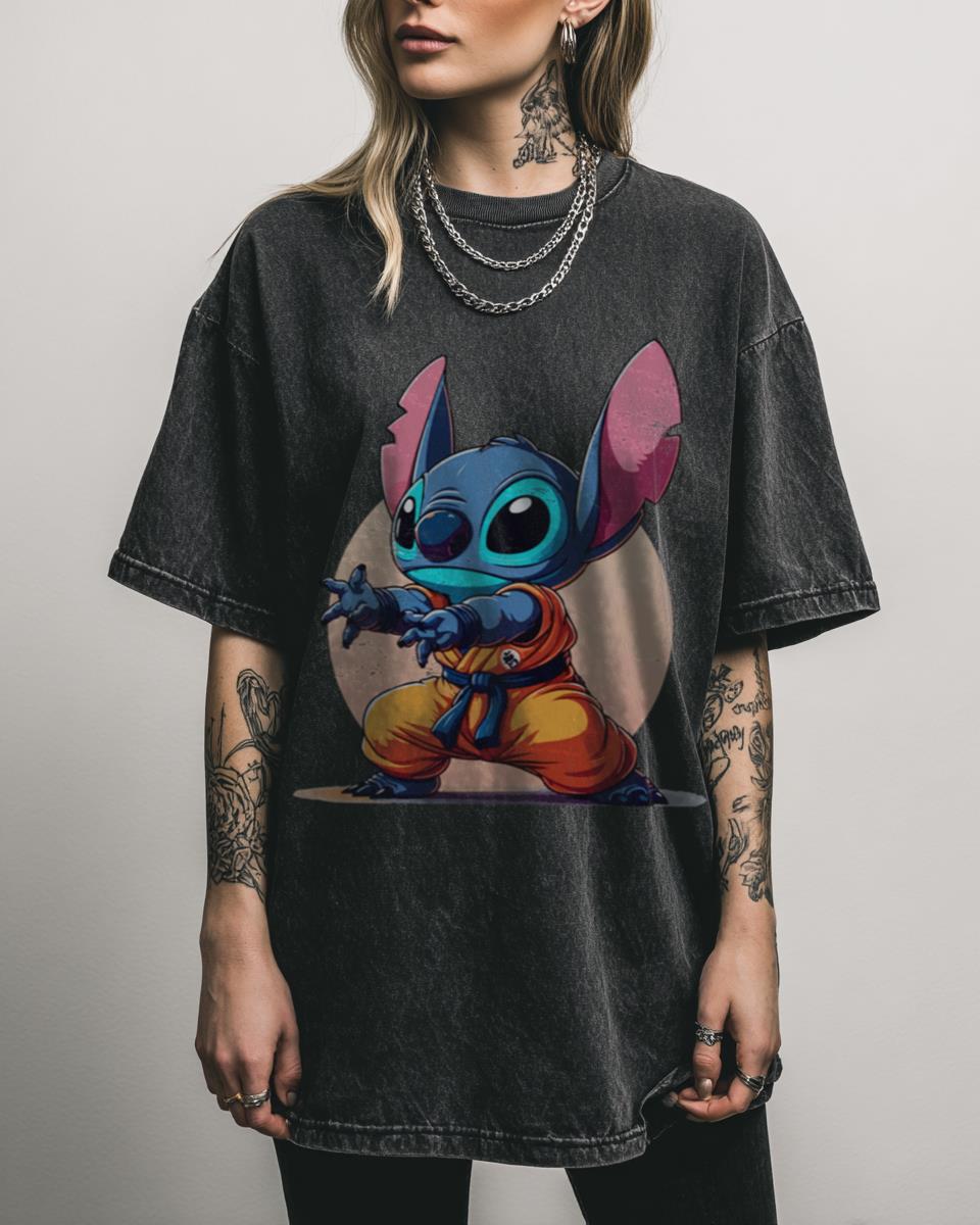 Discover the Fun Stitch Cosplaying Goku Anime Fan Art Tee! Get ready for an epic crossover with this **Stitch Cosplaying Goku Anime Fan Art Tee**! Featuring the mischievous blue alien character dressed as the legendary Saiyan warrior, this playful mashup on a black acidwash finish is perfect for fans of both Disney’s Stitch and Dragon…