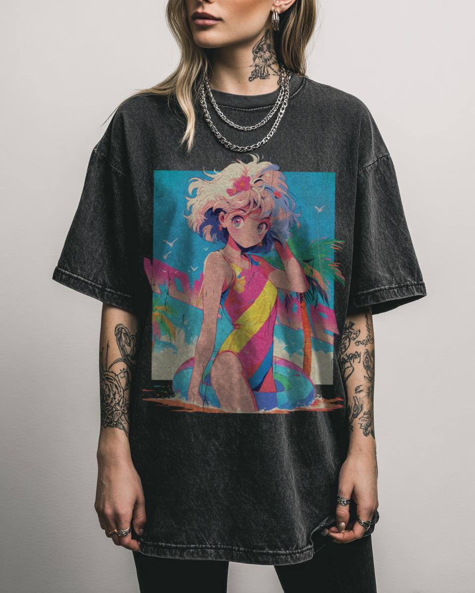 Craving a blast from the past with a touch of anime charm? Indulge in pure nostalgia with this delightful retro design, showcasing a cute anime beach girl embodying the vibrant spirit of the 1980s. Her bright summer colors and the distinctive Japan City Pop aesthetic evoke coastal beauty and a sense of timeless summer fun….