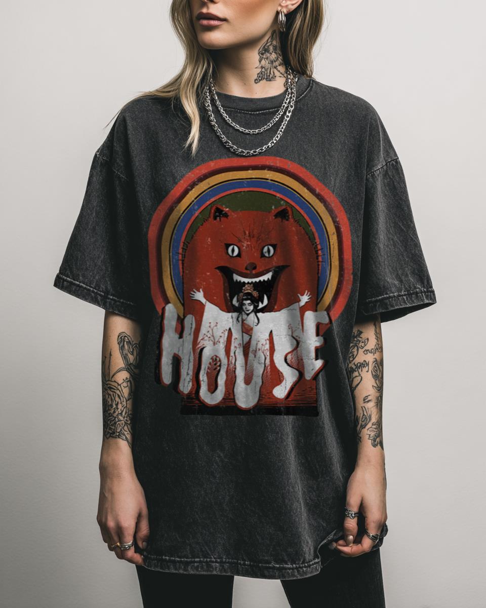 Are you a connoisseur of unique and surreal Japanese horror cinema? Dare to wear this ‘Hausu (ハウス) Retro Japanese Horror Movie’ graphic t-shirt, celebrating the iconic and bizarre 1977 film. This design is perfect for fans of cult classic horror, vintage Japanese cinema, and anyone who appreciates the truly original and terrifying artistry of ‘House’….