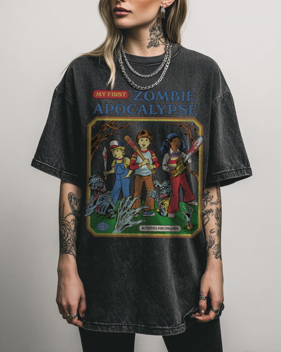 Ready for a humorous take on the end of the world, straight from your childhood dreams? Embrace the delightfully dark humor with this ‘My First Zombie Apocalypse’ design, channeling the nostalgic aesthetic of classic 70s and 80s children’s books. This funny graphic playfully reimagines the undead invasion with a vintage, innocent charm, perfect for horror…