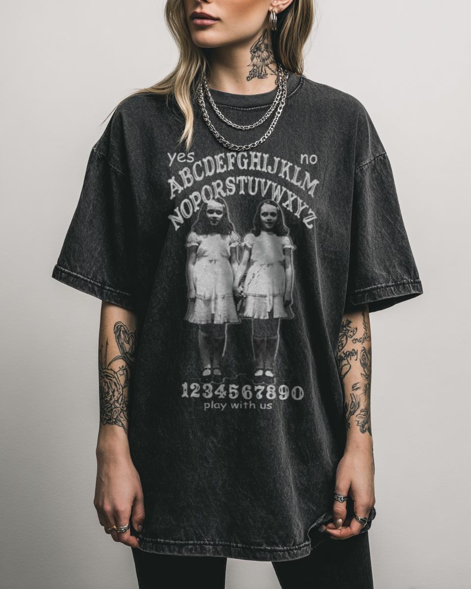 Looking for a chilling design that combines classic horror with occult mystique? Dare to play with spirits with this ‘Shining Twins Ouija’ T-Shirt, a haunting blend of iconic horror and supernatural elements. Featuring the eerie twins from a legendary film alongside a spooky ouija board, this design is perfect for fans of the macabre and…