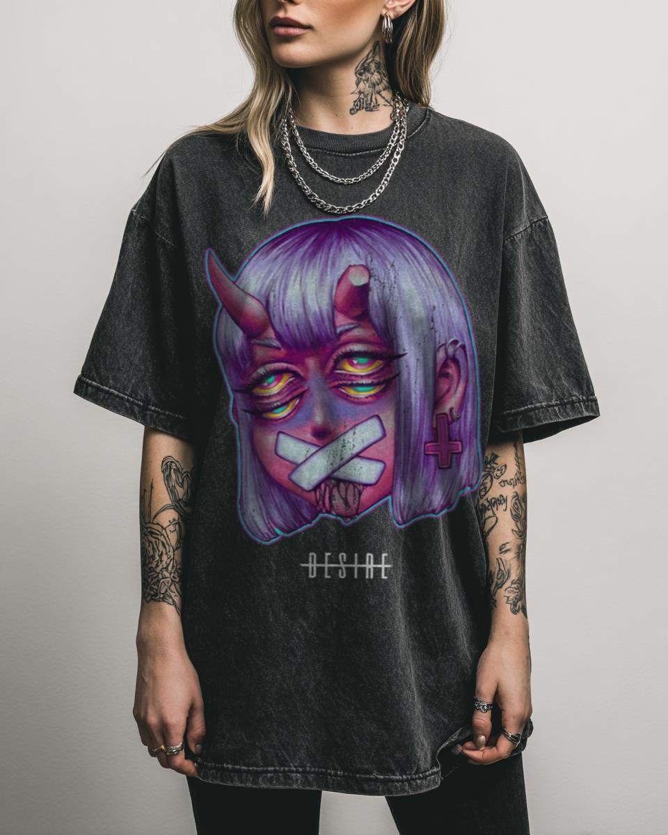 Looking for a unique anime tee that blends dark aesthetics with a splash of color? Unleash your ‘Desire’ with this striking pastel goth anime demon girl tee! Featuring a captivating design inspired by Harajuku, neon, and visual kei styles, this shirt is perfect for those who love alternative fashion, punk vibes, and a touch of…