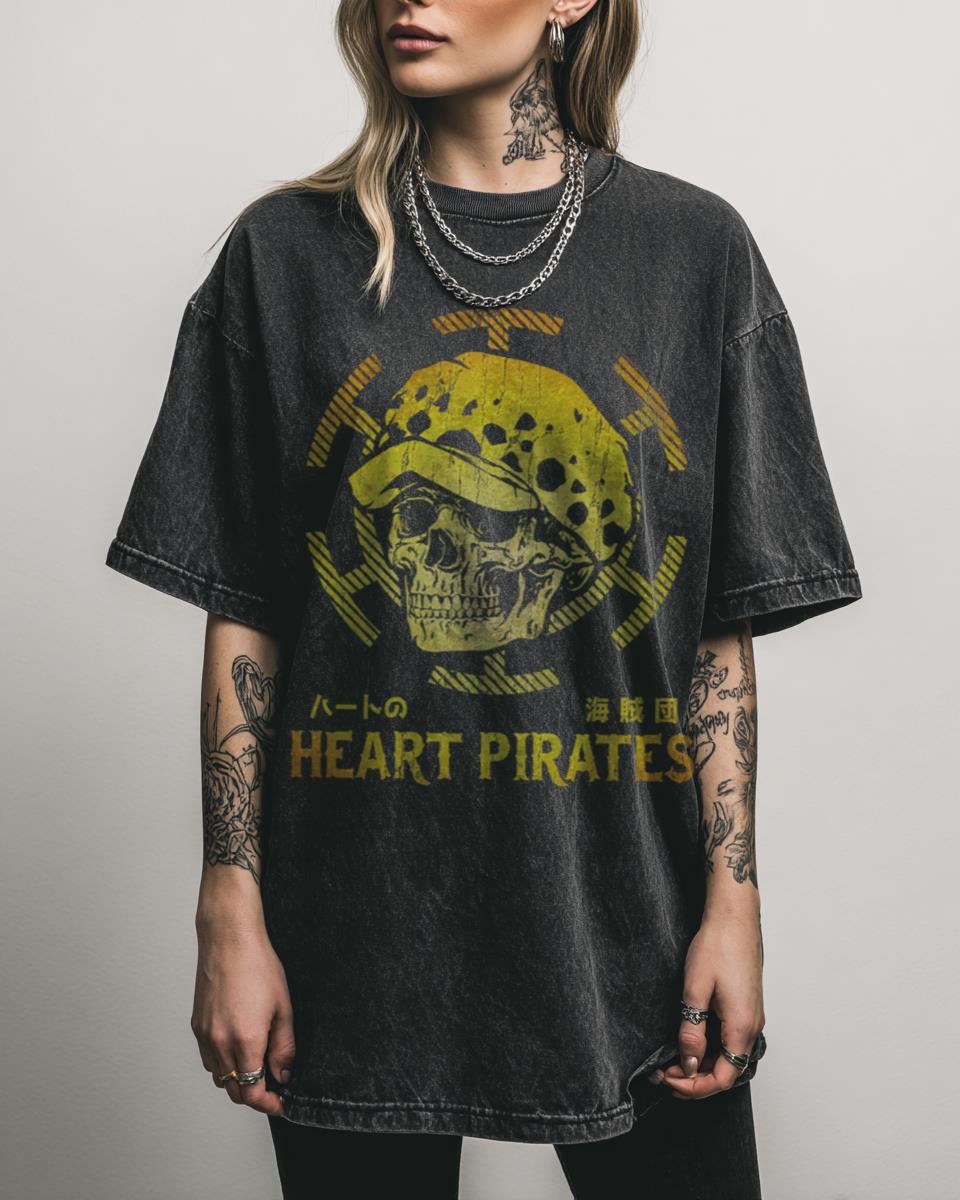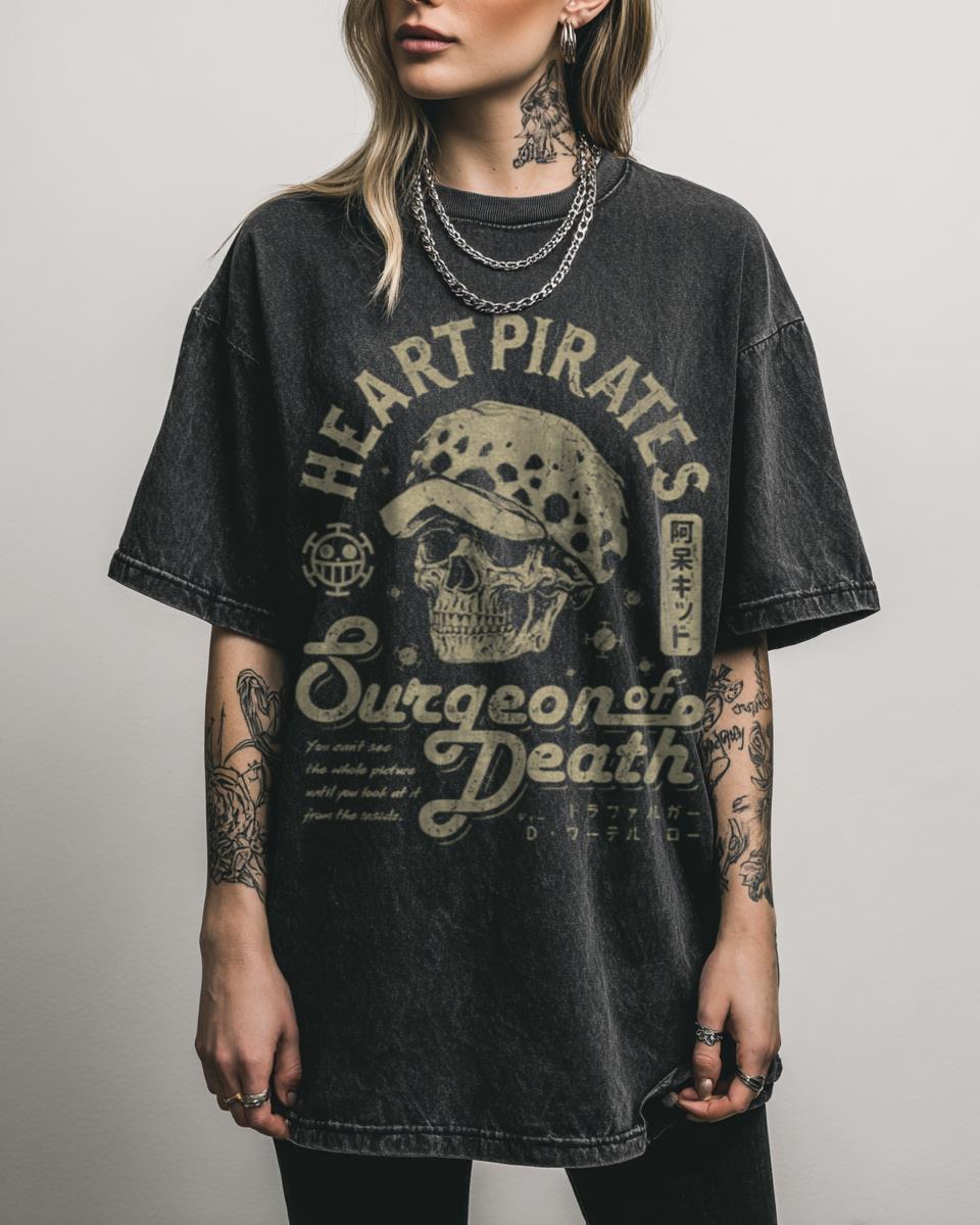Are you ready to join the crew of the Surgeon of Death? Show your allegiance to the ‘Heart Pirates’ with this iconic design from One Piece. This graphic represents Trafalgar Law’s notorious crew, a formidable force in the Grand Line. Perfect for fans of the Straw Hats, Ace, Luffy, and the thrilling world of manga…