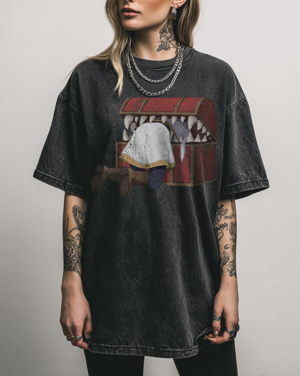 Are you a fan of epic fantasy, anime adventures, and a touch of dark humor? Dive into the whimsical yet perilous world of Frieren with this unique anime t-shirt. Featuring the beloved elf mage Frieren in a comically unfortunate encounter with a classic RPG mimic chest, this design captures a memorable moment with a twist….