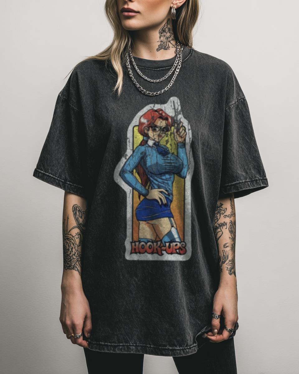 Looking for a throwback to the edgy 90s skate and anime scene? Step into retro cool with this “Vintage Anime Girl Hook-Ups Skate” graphic tee! This design captures the iconic aesthetic of 90s skate brands like Hook-Ups, featuring a provocative yet playful anime girl. Perfect for fans of vintage anime, skate culture, punk, and anyone…