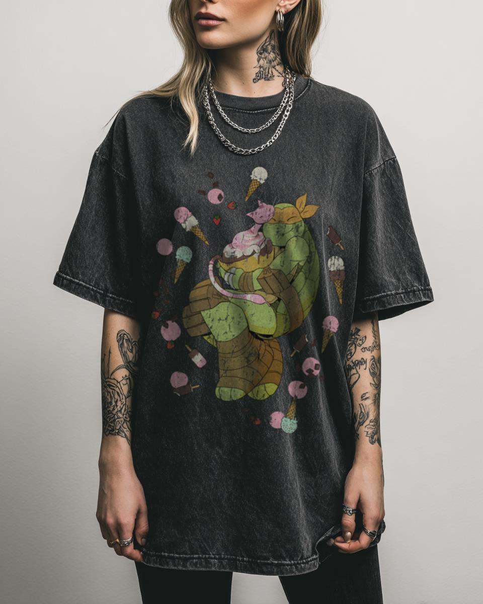 Why This TMNT Michelangelo & Ice Cream Kitty Tee is So Sweet? Embrace the adorable side of the sewers with this charming TMNT Michelangelo Ice Cream Kitty ‘Sweet Besties’ black acidwash T-shirt! Featuring a cute, fan-created graphic of Mikey and his unique pet, this 100% cotton tee is perfect for Teenage Mutant Ninja Turtles fans…