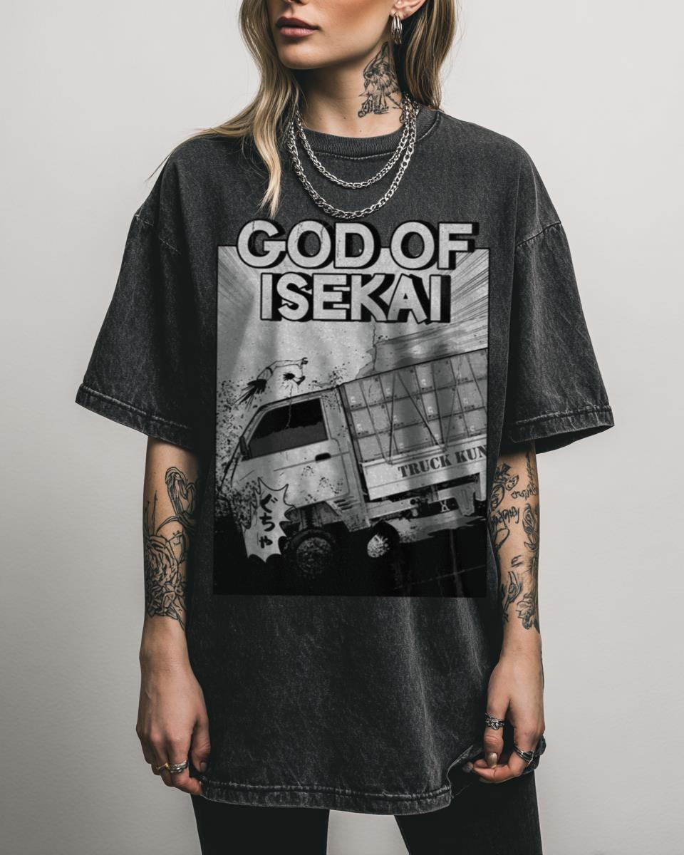 Are you a true connoisseur of the Isekai genre? Celebrate the ultimate architect of new beginnings with this ‘God of Isekai’ graphic tee, featuring the infamous Truck-kun. This design playfully acknowledges the catalyst for countless adventures in the Japanese anime and manga world, a must-have for every otaku. Why You’ll Love This: High-quality printed graphics…