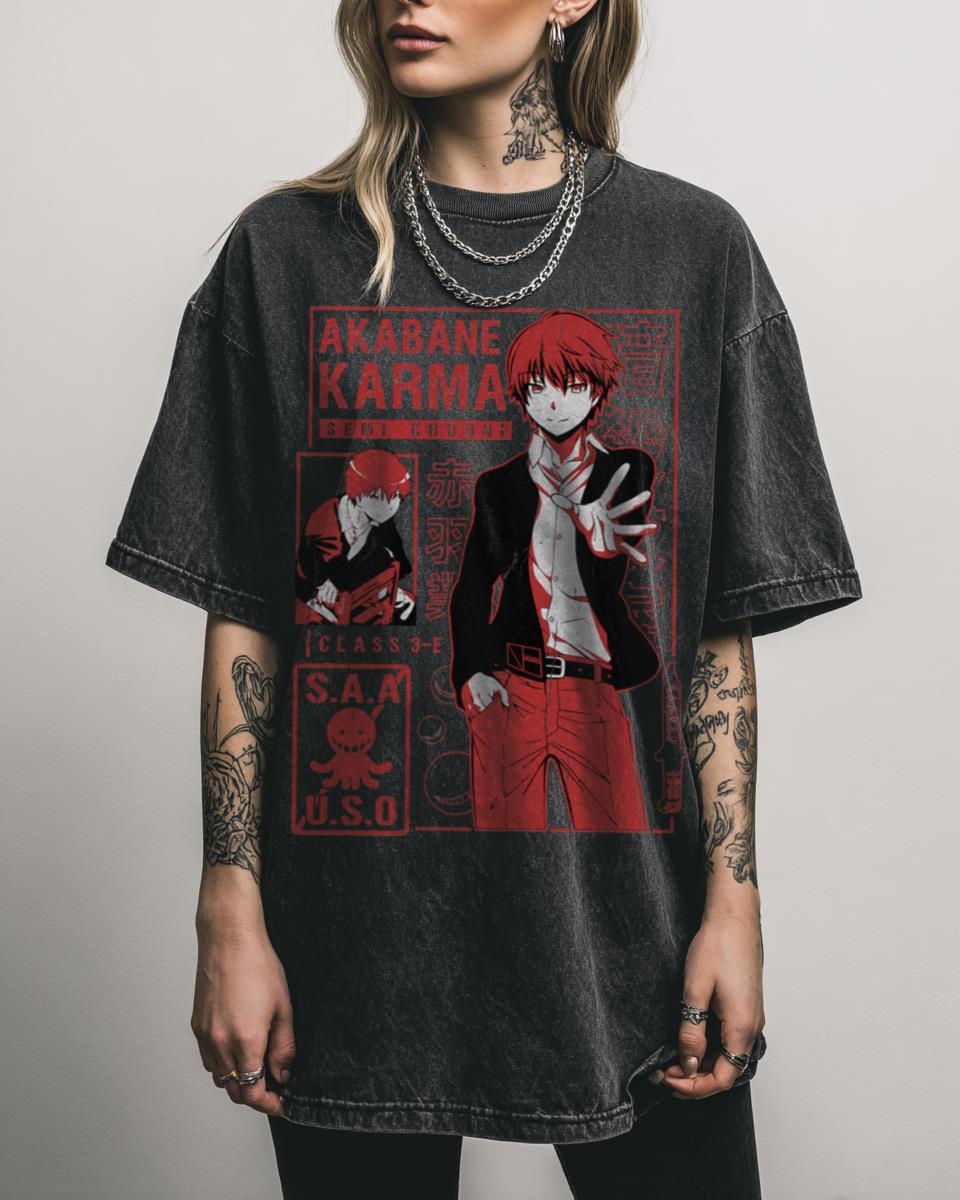 Are you a fan of the cunning and charismatic Karma Akabane from Assassination Classroom? Show your allegiance to Class 3-E with this cool ‘Karma book cover’ style design, inspired by the popular anime and manga series Assassination Classroom. Featuring Karma Akabane alongside characters like Koro Sensei and Nagisa Shiota, this graphic is a must-have for…
