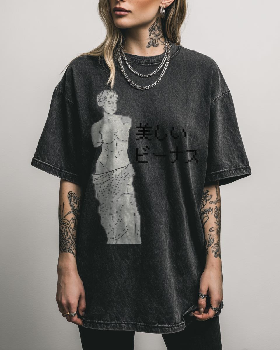 Searching for a unique blend of classical art and modern Japanese aesthetic? Discover the captivating “Aesthetic Venus” design, merging a classic statue with Japanese Kanji and a pixel retro vibe. This tee offers a distinct Harajuku art style, perfect for those who appreciate the beauty of ancient sculptures reinterpreted through a modern, kawaii, and vaporwave…