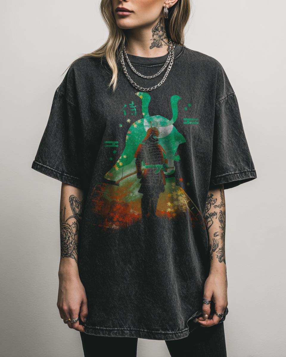 Seeking a unique blend of historical elegance and modern artistic flair? Discover the captivating beauty of this ‘Negative Aki Samurai’ graphic tee. This design masterfully uses negative space to depict a Japanese warrior amidst an autumn landscape, blending traditional Japanese culture with a fantasy aesthetic. It’s a striking silhouette that evokes a sense of peace…