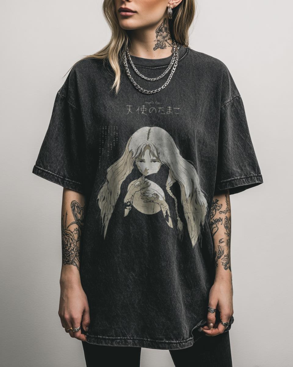 Are you captivated by the ethereal beauty and profound themes of classic 80s anime? Immerse yourself in the haunting elegance of “Angel’s Egg” (Tenshi no Tamago) with this vintage-inspired t-shirt. This design pays homage to Mamoru Oshii’s iconic Japanese animation, perfect for fans of surreal, philosophical, and retro anime aesthetics. Wear a Piece of Anime…