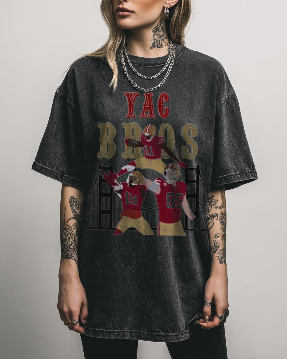 Are you a die-hard fan of the San Francisco 49ers and their dynamic YAC Bros? Cheer on your favorite team with this ‘YAC Bros’ T-Shirt! Featuring a design that celebrates the incredible talent of players like Deebo Samuel, George Kittle, and Brandon Aiyuk, this tee is perfect for any loyal 49ers fan. Show your pride…