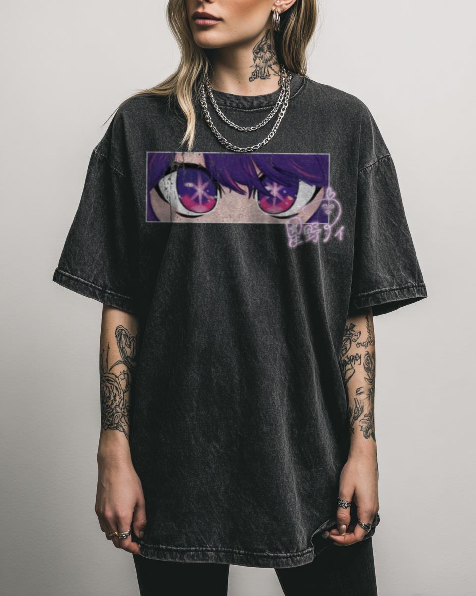 Captivate everyone with the iconic eyes of Ai Hoshino! This “Ai Hoshino Eyes” T-shirt features a mesmerizing design highlighting the unique, star-filled eyes of the beloved idol from Oshi No Ko. Perfect for fans of cute anime girls, manga, and the captivating story of Ai Hoshino, Aquamarine, and Ruby. This tee is a subtle yet…