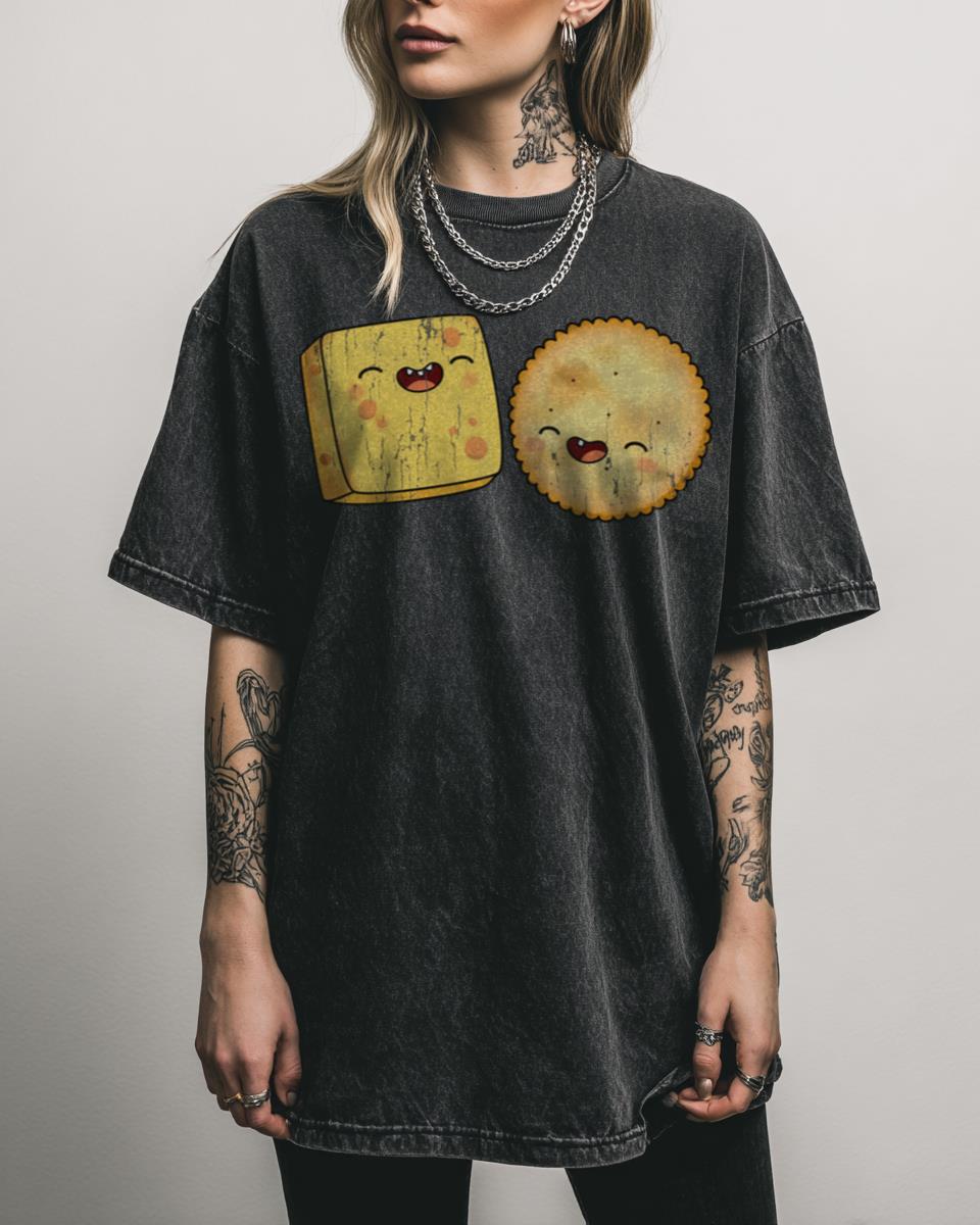 Who knew cheese and crackers could be this adorable? Embrace the cuteness with this kawaii tee! This charming graphic tee features a happy, kawaii cheese slice and cracker, personified with sweet faces, making it an irresistibly cute piece of food art. It’s a perfect design for anyone who loves adorable snacks, minimalist kawaii aesthetics, and…