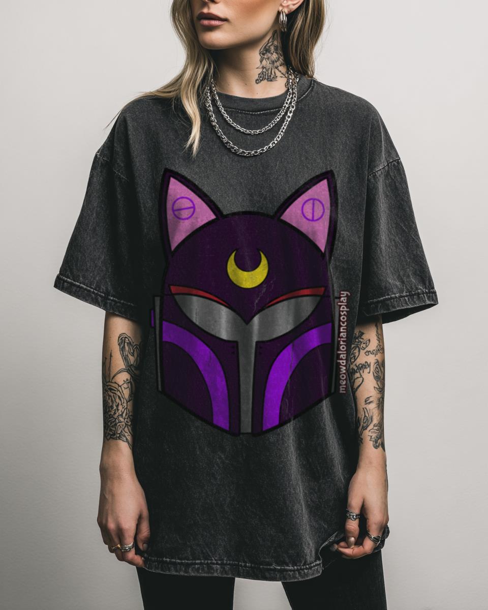 What Makes This Luna Meowdalorian T-Shirt a Fan Favorite? This is the way… to awesome style! This Luna Meowdalorian T-Shirt is a brilliant fan-created crossover parody, blending Sailor Moon’s iconic feline companion, Luna, with the legendary bounty hunter aesthetic of The Mandalorian from Star Wars. Printed on a unique black acidwash 100% cotton tee. Features…