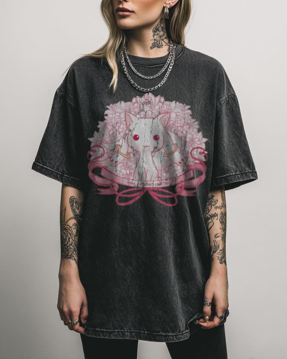 Have you ever wondered about making a contract with a magical creature? Embrace the adorable yet enigmatic presence of Kyubey with this ‘Madoka Magica’ design. Featuring the iconic magical creature from ‘Puella Magi Madoka Magica’, this graphic is perfect for anime fans who appreciate the series’ unique blend of cute aesthetics and dark storytelling. Just…