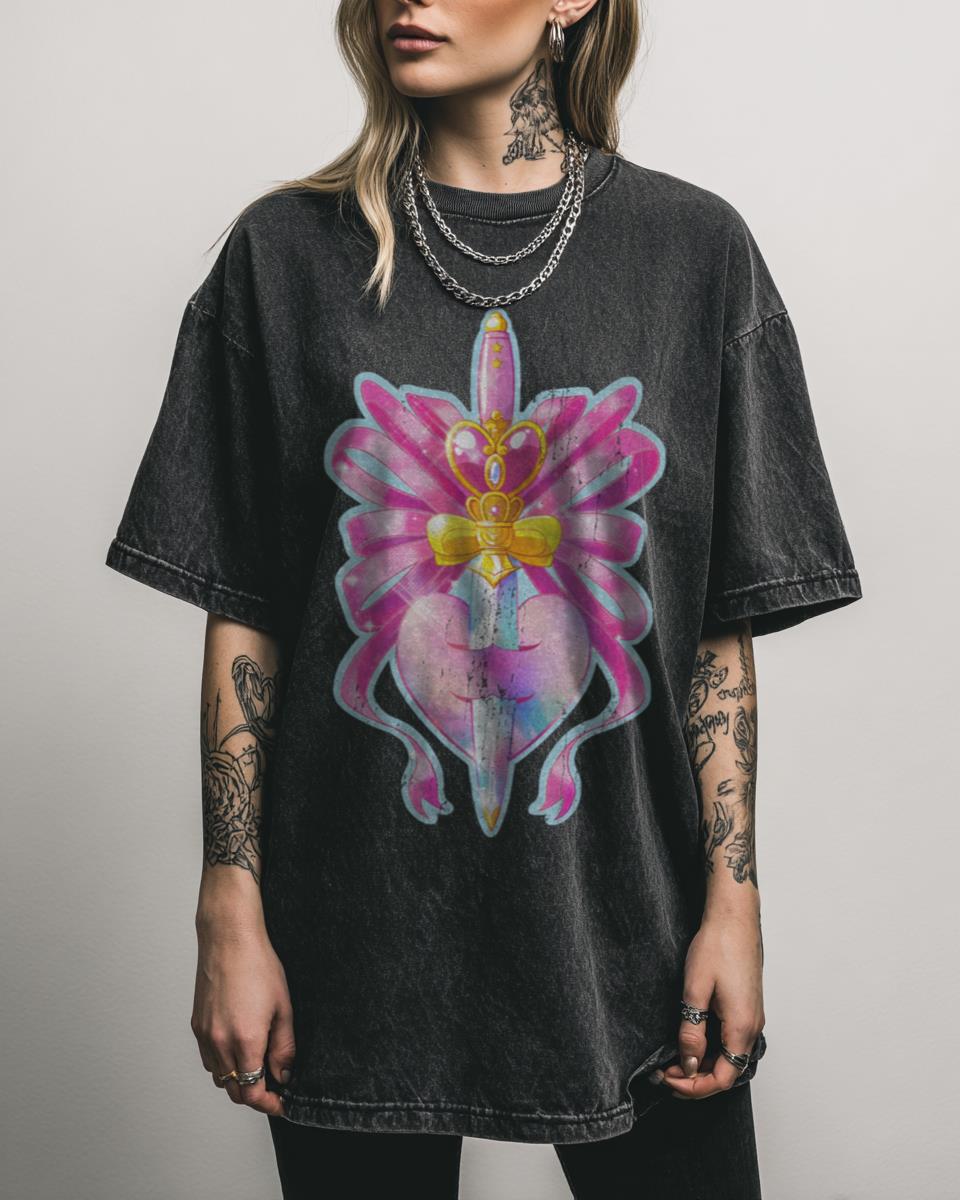 Unleash your inner magical girl with this fierce ‘Moon Spiral Heart Attack’ design! This T-shirt reimagines the iconic Sailor Moon attack with a bold ‘Sailor Dagger’ twist and a cool tattoo aesthetic. Infused with 90s nostalgia, glittering elements, and rainbow hues, it’s a powerful and unique tribute to the beloved magical girl genre, combining sweetness…