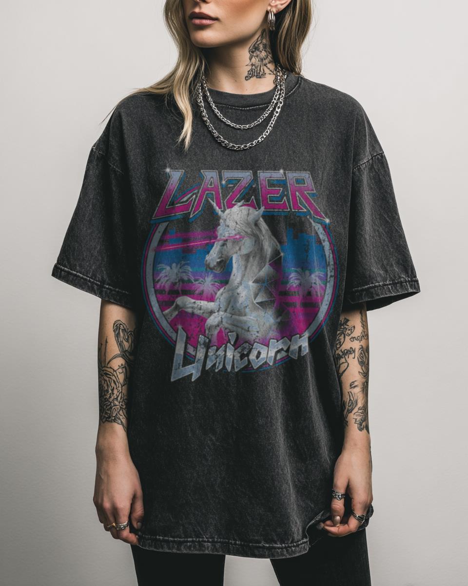 Unleash the Magic with This Lazer Unicorn T-Shirt? Step into a dazzling realm of retro fantasy with this **Lazer Unicorn T-Shirt**, an electrifying graphic tee that fuses 80s neon aesthetics with mythical creature majesty. This design is perfect for anyone who loves magical animals, vibrant colors, and a touch of vintage cool. The black acidwash…