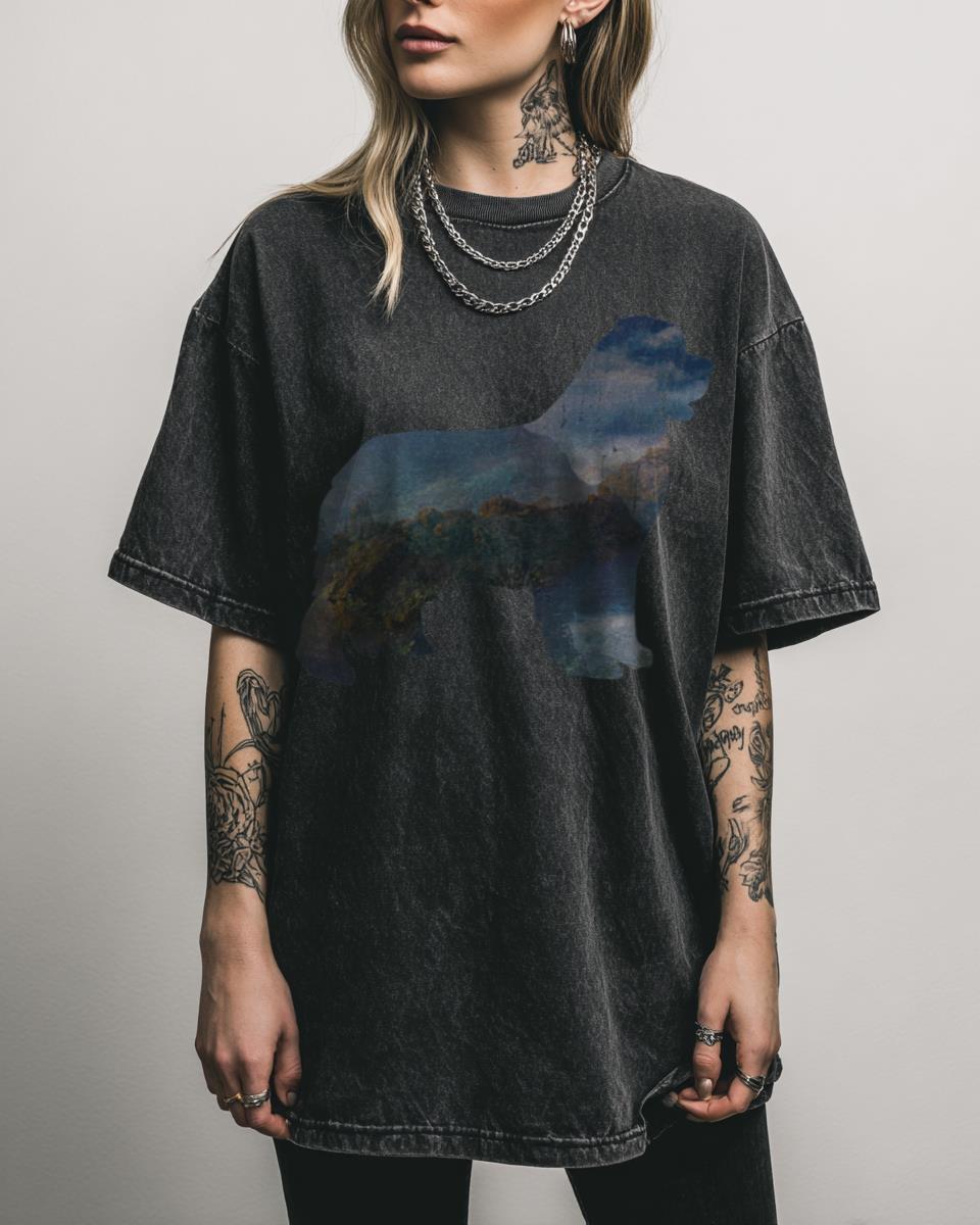 Are you a proud owner or admirer of the majestic Newfoundland dog breed? Celebrate the grandeur of the “Newfoundland Dog” with this beautiful silhouette fantasy design. Featuring a majestic Newfie against a serene ocean landscape with trees, this tee captures the gentle giant’s noble spirit, perfect for dog lovers and those who appreciate stunning animal…