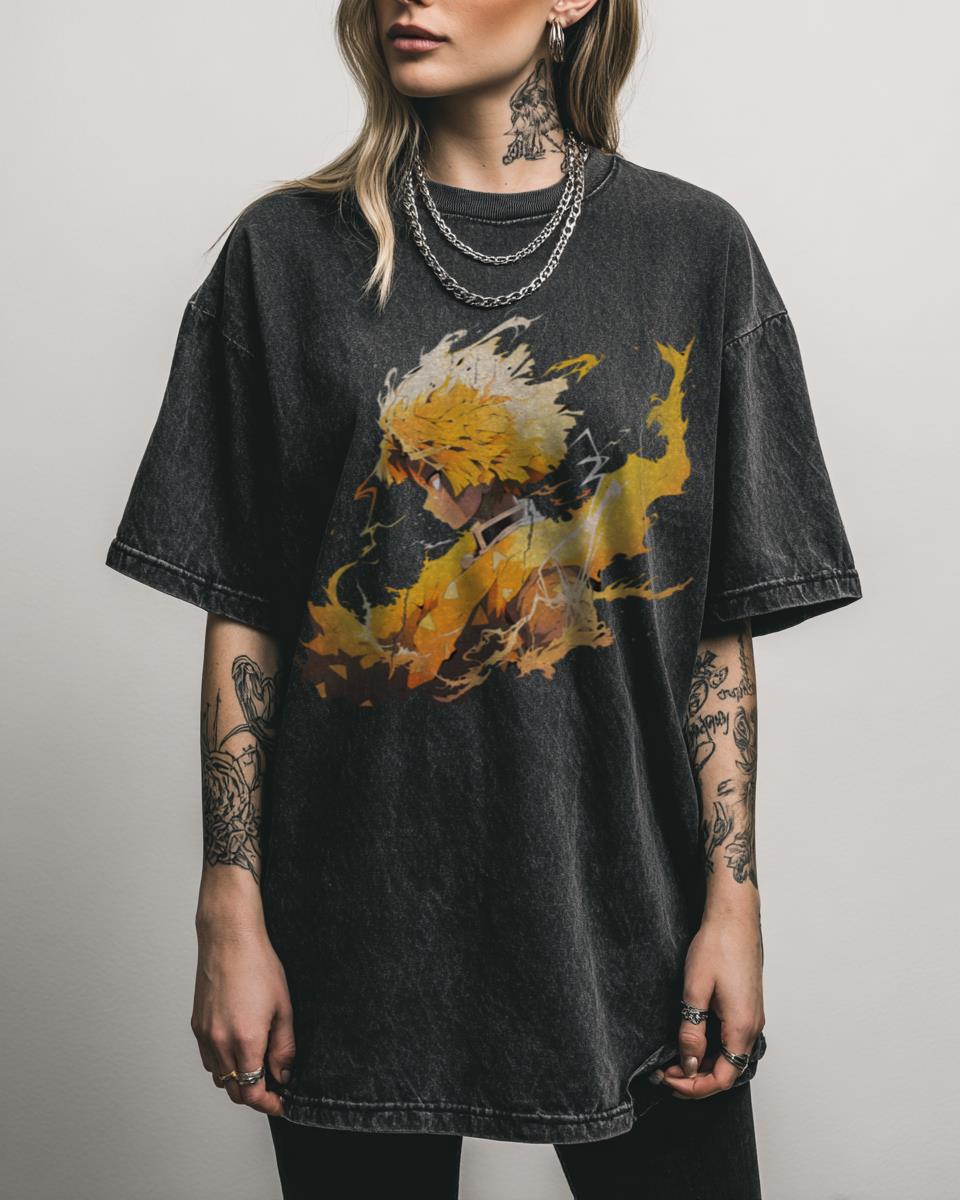 Ready to electrify your style with a fan-favorite Demon Slayer character? Channel the lightning-fast courage of Zenitsu Agatsuma with this dynamic ‘Zenitsu’ graphic tee. A must-have for fans of Demon Slayer: Kimetsu No Yaiba, this design celebrates the cowardly yet powerful demon slayer, perfect for expressing your love for the iconic anime and manga series….