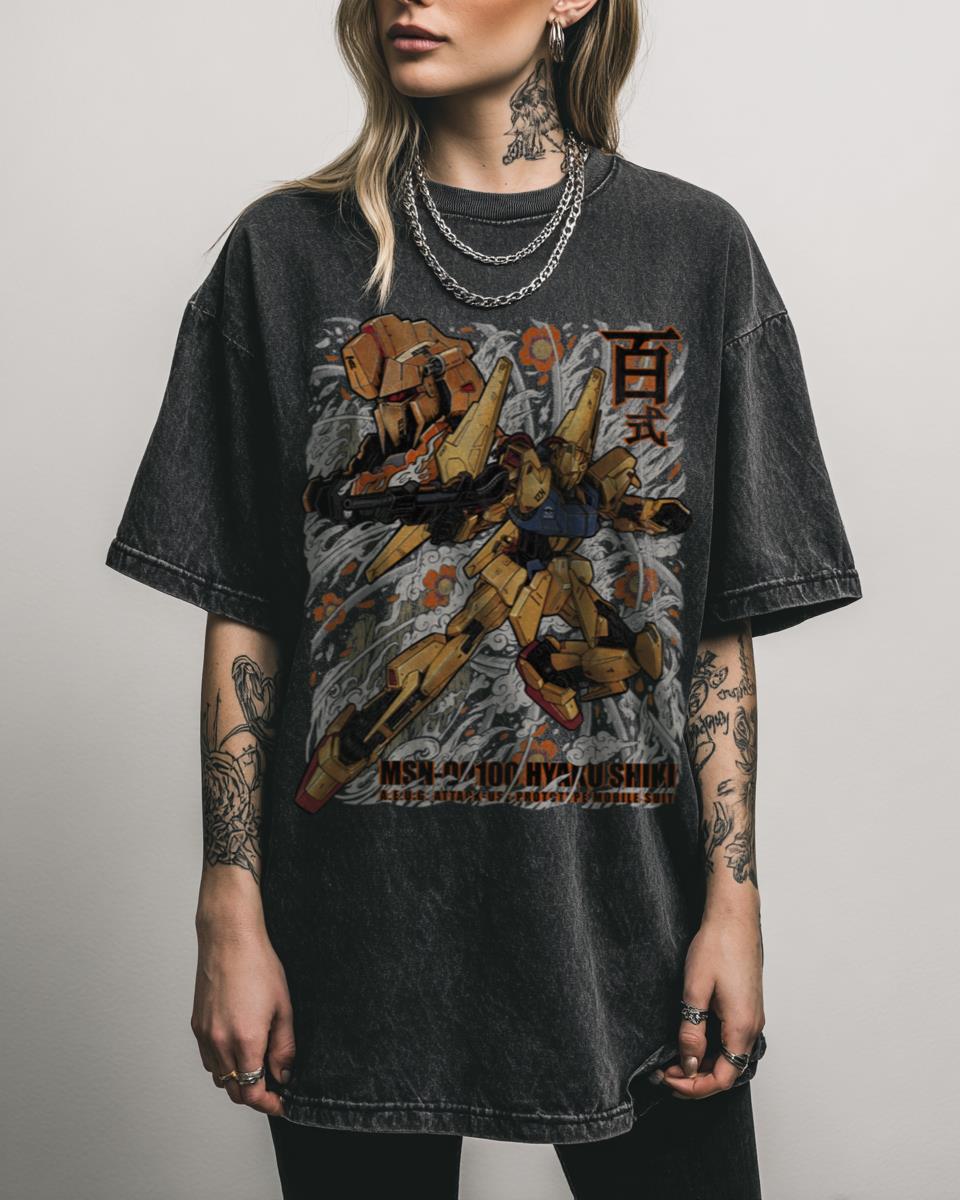 Do you pilot your way through the Universal Century with iconic mobile suits? Command the battlefield with this striking “MSN-00100 Hyaku Shiki” design, a tribute to the legendary mobile suit from the Gundam universe, particularly “Char’s Counterattack.” Perfect for fans of Japanese anime, manga, and mecha robots, this tee celebrates the intricate design and power…