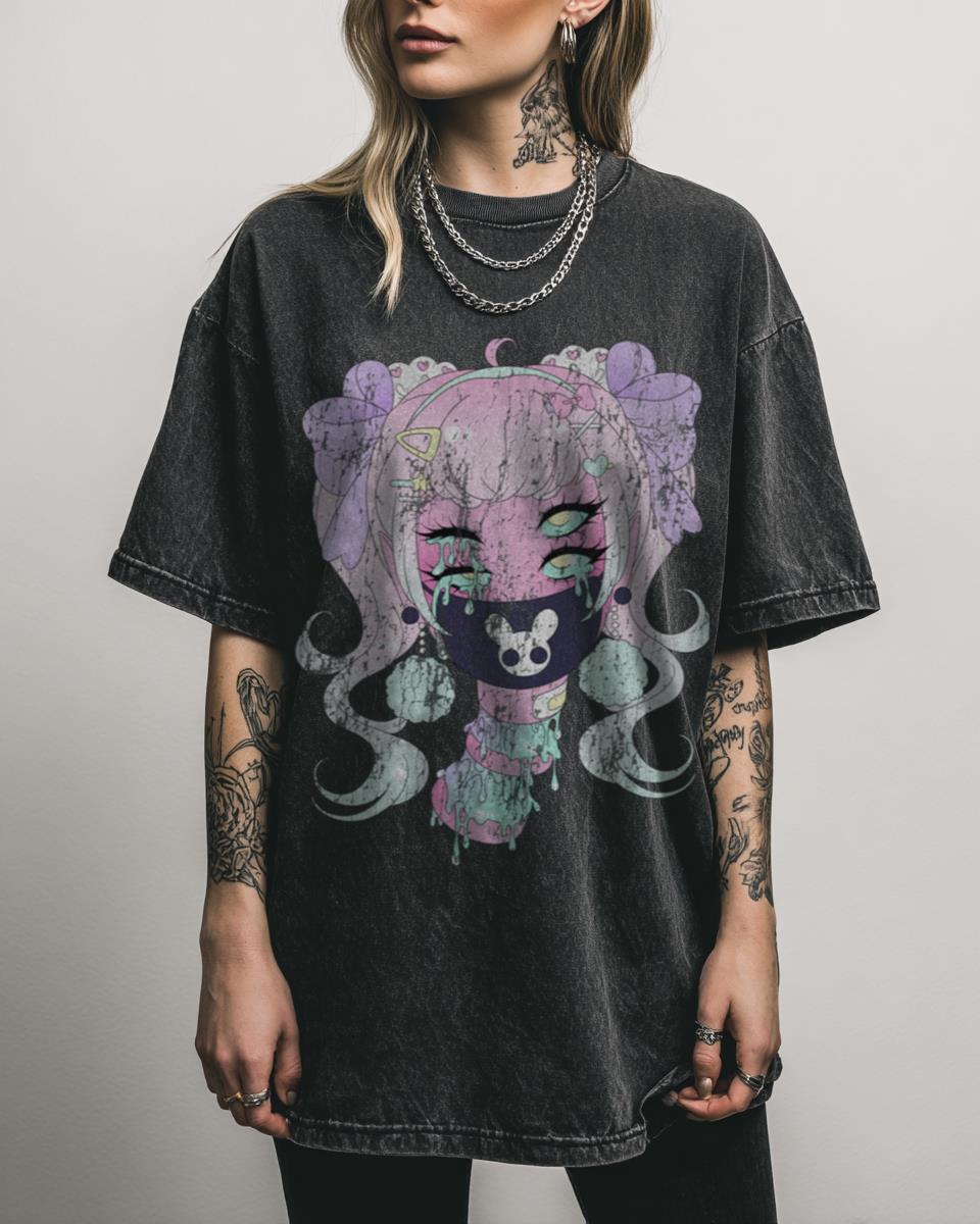 What Makes This MELT Anime Girl T-Shirt Uniquely Appealing? Embrace the captivating aesthetic of “creepy cute” with this MELT Anime Girl T-shirt. Featuring a melting, goo-like character in a Menhera-inspired style, this black acidwash tee is perfect for those who love unique Japanese art and alternative fashion. Features of Your Creepy Cute Menhera Graphic Tee:…