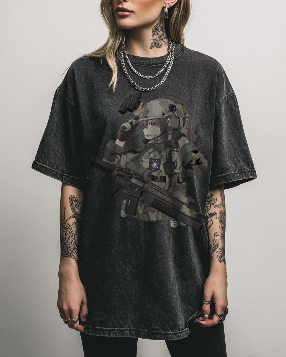 Why is This Military Anime Girl Soldier T-Shirt a Fan Favorite? Command attention with this Military Anime Girl Soldier T-Shirt! Featuring a resilient fan-created graphic of an armed anime girl, this black acidwash graphic tee is an excellent choice for fans of action-oriented anime, military themes, and strong female characters. Key Features of This Anime…