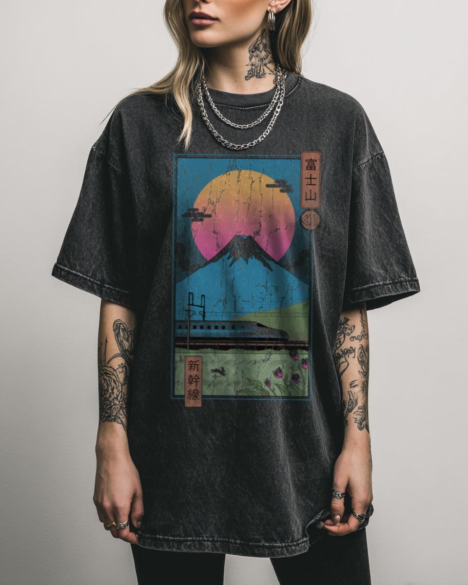 Are you captivated by the timeless beauty of Japanese landscapes and modern marvels? Experience the fusion of tradition and modernity with this stunning ‘Shinkansen in Mt. Fuji’ T-shirt, inspired by classic Ukiyo-e Japanese art. This retro design, by Vincent Trinidad, beautifully depicts a bullet train against the iconic Mt. Fuji. Why You’ll Love This Artistic…