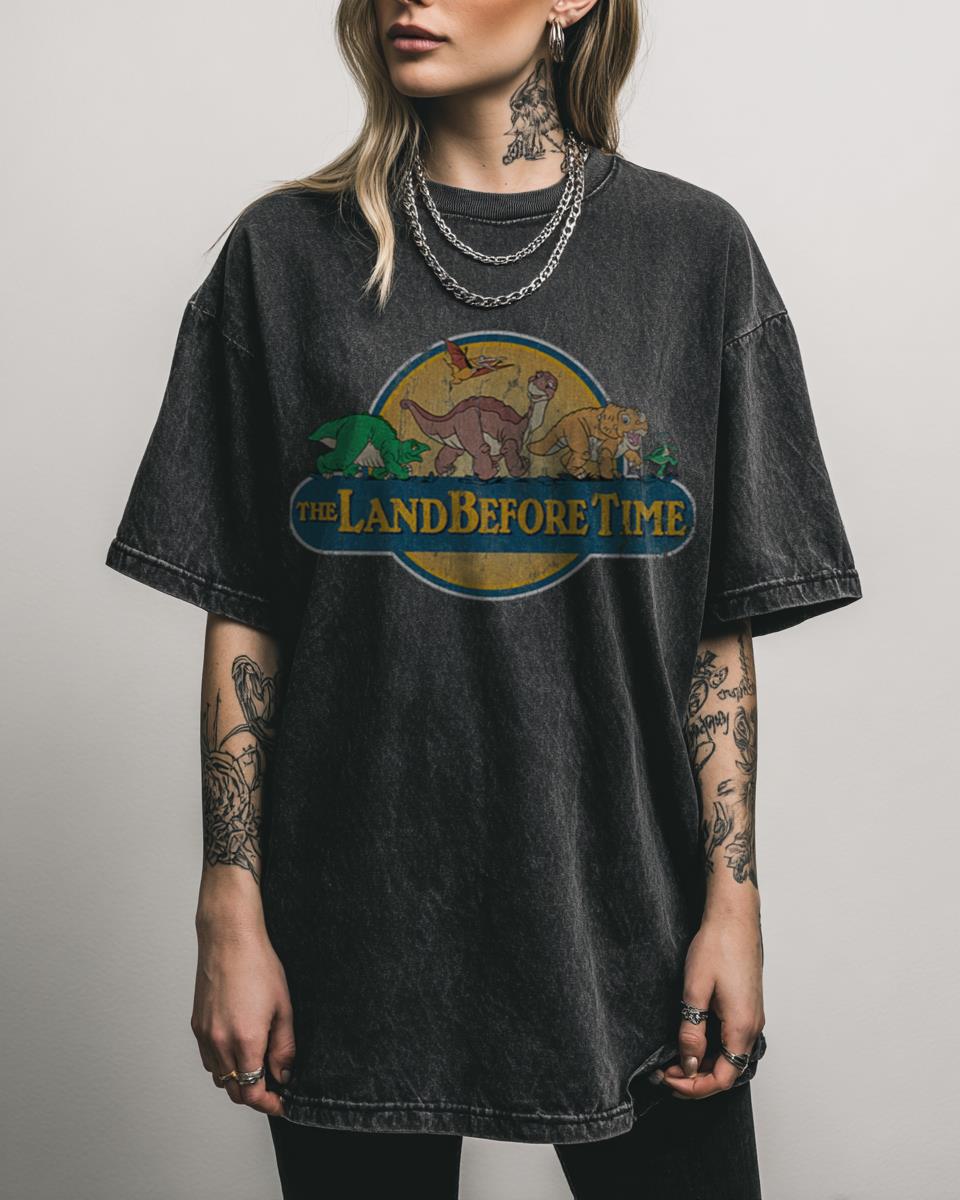 Journey to the Great Valley with This Vintage Land Before Time Dinosaur T-Shirt? Rekindle your childhood wonder with this Vintage Land Before Time Dinosaur T-Shirt! This fan-created graphic tee pays tribute to the beloved 80s/90s animated movie and its iconic characters like Littlefoot and Ducky. The unique black acidwash fabric adds a cool, nostalgic edge,…