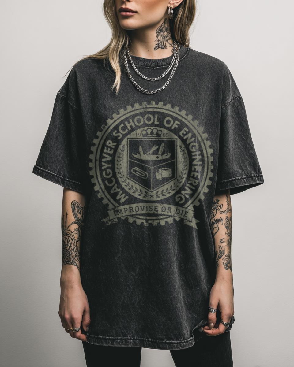 Are You Ready for the MacGyver School of Engineering T-Shirt? Show off your ingenuity with this Vintage MacGyver School of Engineering T-Shirt! This fan-created graphic tee pays homage to the iconic 80s TV show and its resourceful hero, Angus MacGyver. The unique black acidwash fabric adds a retro, worn-in look, perfect for engineers, problem-solvers, and…