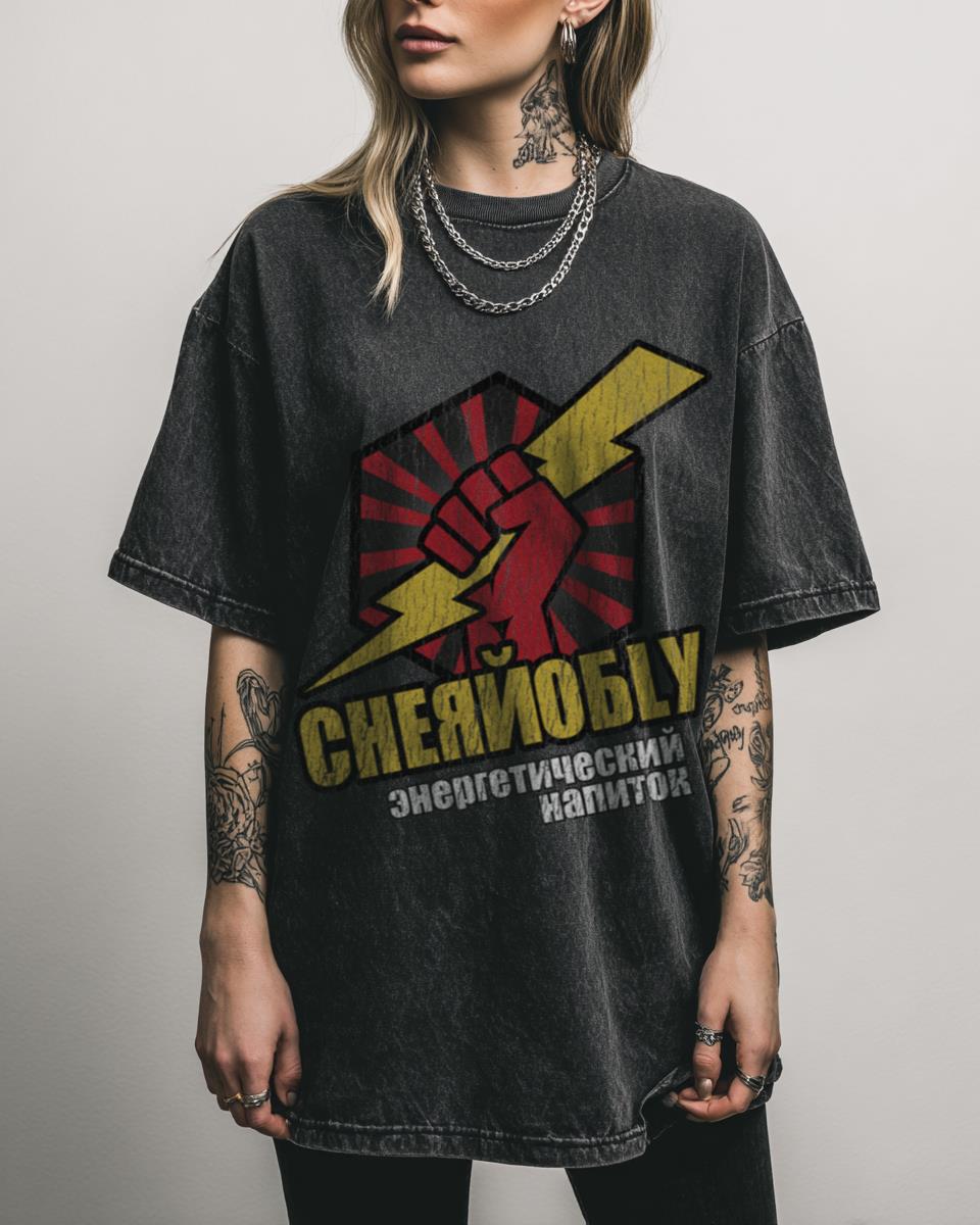 What Makes This Chernobly Energy Drink T-Shirt Iconic? Relive the hilarious 80s nostalgia with this Chernobly Energy Drink T-Shirt, a clever parody inspired by the movie Hot Tub Time Machine. This black acidwash tee, crafted from 100% cotton, is perfect for fans of retro films and humorous pop culture references. Highlights of This Movie Parody…