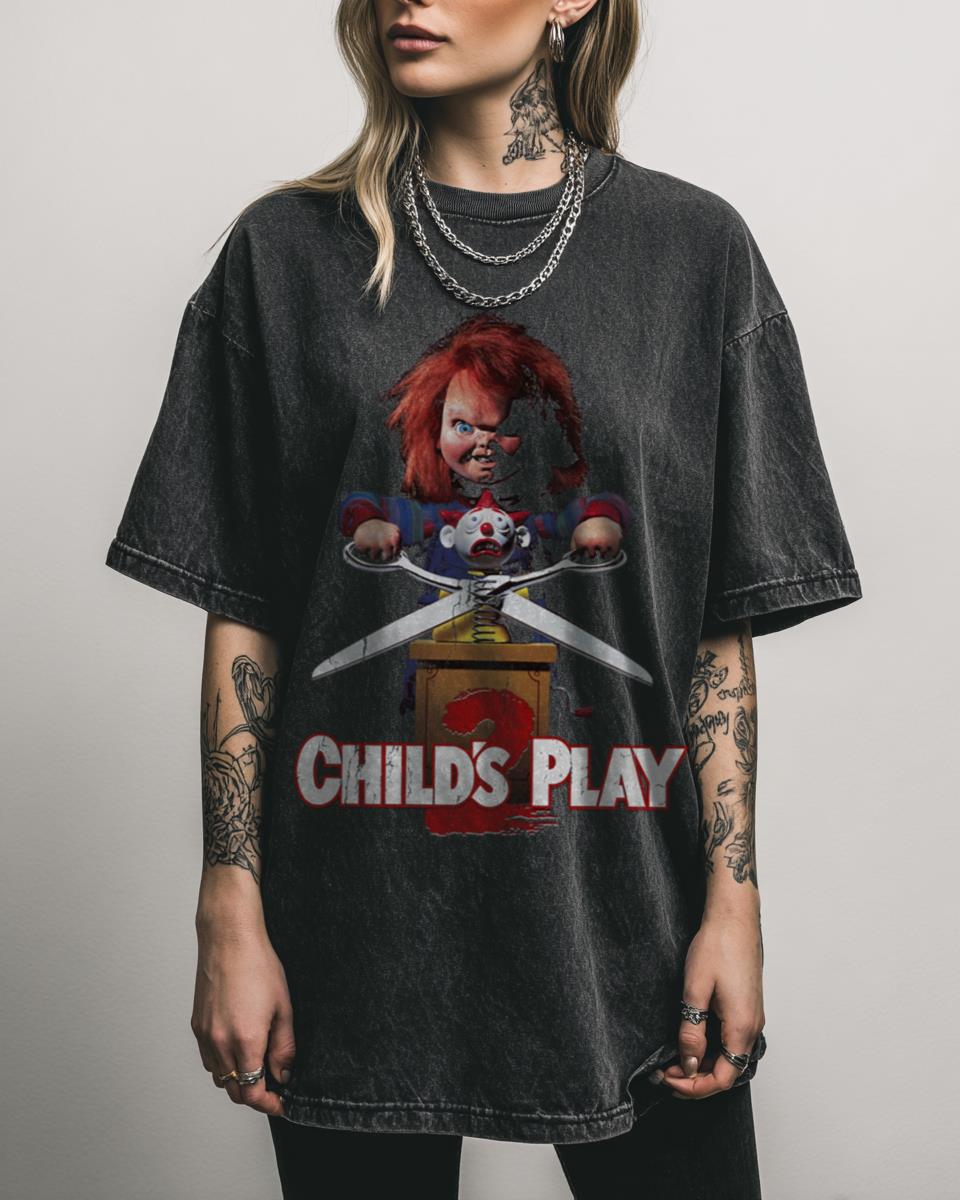 Dare to wear a piece of classic horror cinema? Step into the terrifying world of ‘Child’s Play 2’ with this iconic Chucky design! Featuring the infamous Good Guys doll, this artwork perfectly captures the chilling essence of the 80s horror classic. It’s a must-have for any horror movie enthusiast or fan of the legendary killer…