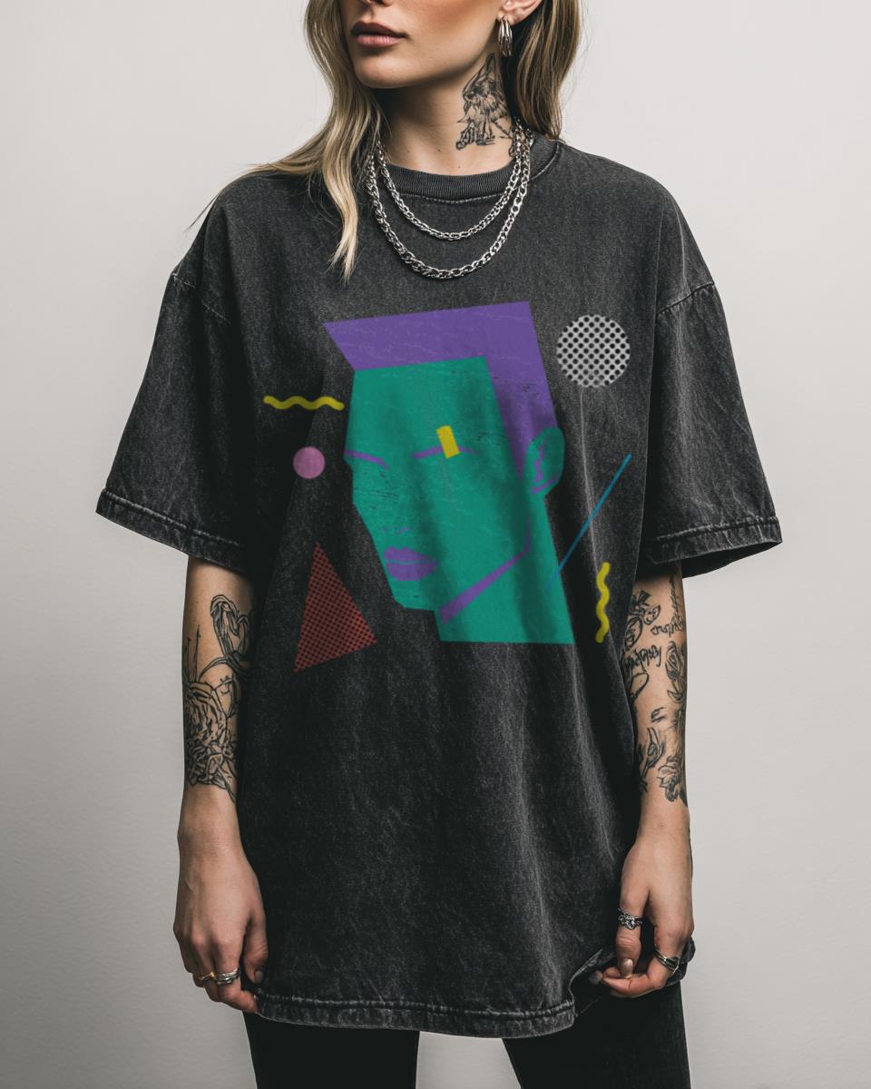 What Makes This Grace Jones 80s Style Geometric T-Shirt Iconic? Channel the legendary style of Grace Jones with this **80s Style Purple Geometric T-shirt**, a fan-created design celebrating the iconic artist. Featuring a bold, abstract graphic in purple hues on a **black acidwash 100% cotton tee**, it’s perfect for fans of retro fashion and music…