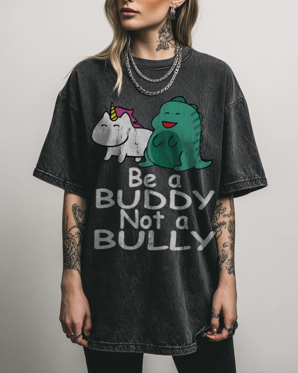 Ready to spread a message of kindness and stand up against bullying? Promote positivity with this enchanting ‘Be a Buddy Not a Bully’ graphic t-shirt! This design features a heartwarming array of mythical creatures like dragons and unicorns, alongside a friendly dinosaur, all advocating for kindness and anti-bullying. It’s a powerful statement piece for anyone…
