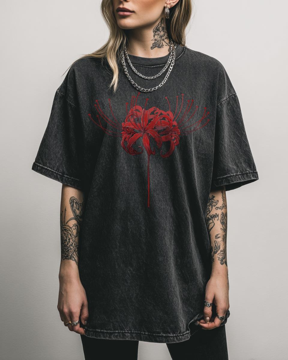 Captivated by the striking beauty of Japanese flora? Adorn yourself with the ethereal beauty of the “Red Spider Lily” (Higanbana) with this exquisite graphic tee. This design showcases the stunning Lycoris Radiata flower, deeply symbolic in Japanese culture and often seen in anime and manga for its aesthetic and poignant meanings. It’s a perfect piece…
